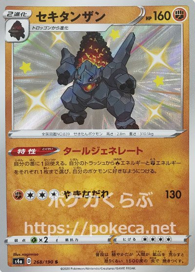 自分の番に1回使える。自分のトラッシュから炎エネルギーと闘エネルギーをそれぞれ1枚まで選び、自分のポケモンに好きなようにつける。やきなだれ 闘無無無 130
