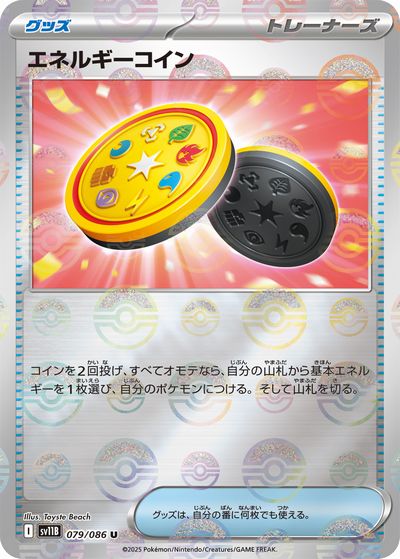 コインを2回投げ、すべてオモテなら、自分の山札から基本エネルギーを1枚選び、自分のポケモンにつける。そして山札を切る。商品仕様