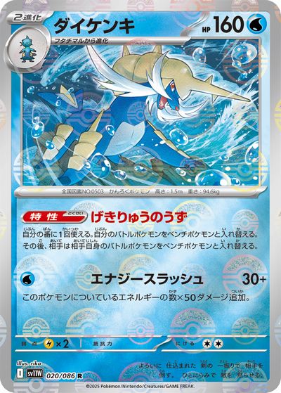 自分の番に1回使える。自分のバトルポケモンをベンチポケモンと入れ替える。その後、相手は相手自身のバトルポケモンをベンチポケモンと入れ替える。エナジースラッシュ 水 30+