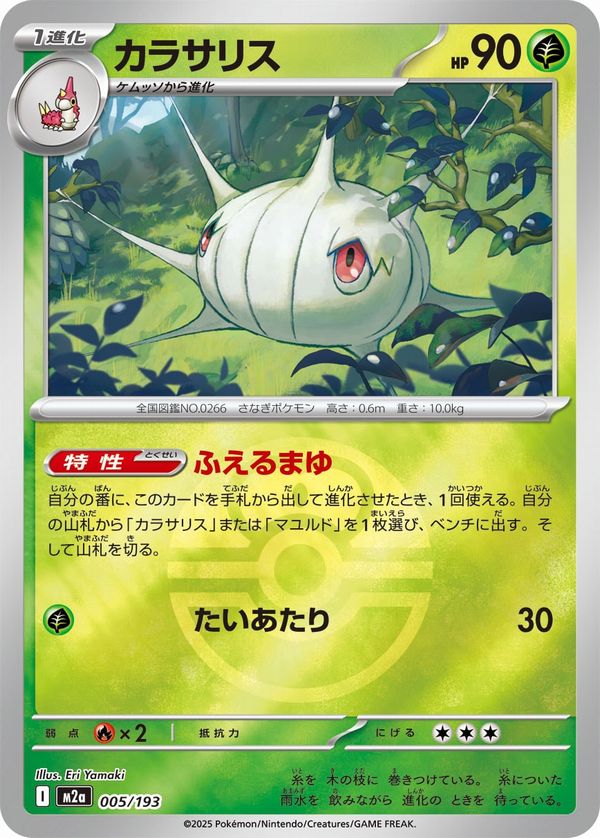 自分の番に、このカードを手札から出して進化させたとき、1回使える。自分の山札から「カラサリス」または「マユルド」を1枚選び、ベンチに出す。そして山札を切る。たいあたり 草 30