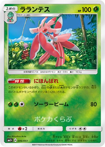 このポケモンがいるかぎり、自分の草または炎ポケモンが使うワザの、相手のバトルポケモンへのダメージは「+20」される。ソーラービーム 草草無 80