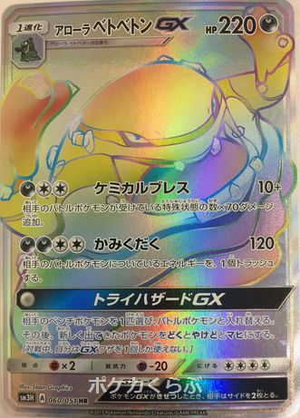 相手のバトルポケモンについているエネルギーを、1個トラッシュする。トライハザードGX 相手のベンチポケモンを1個選び、バトルポケモンと入れ替える。その後、新しく出てきたポケモンをどくとやけどとマヒにする。[対戦中、自分はGXワザを1回しか使えない。]