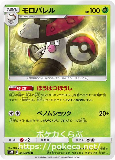 自分の番に、自分の手札からワザ「キノコのほうし」を持つポケモンを場に出すたび、1回使える。相手のバトルポケモンをどくとねむりにする。ベノムショック 無無 20+